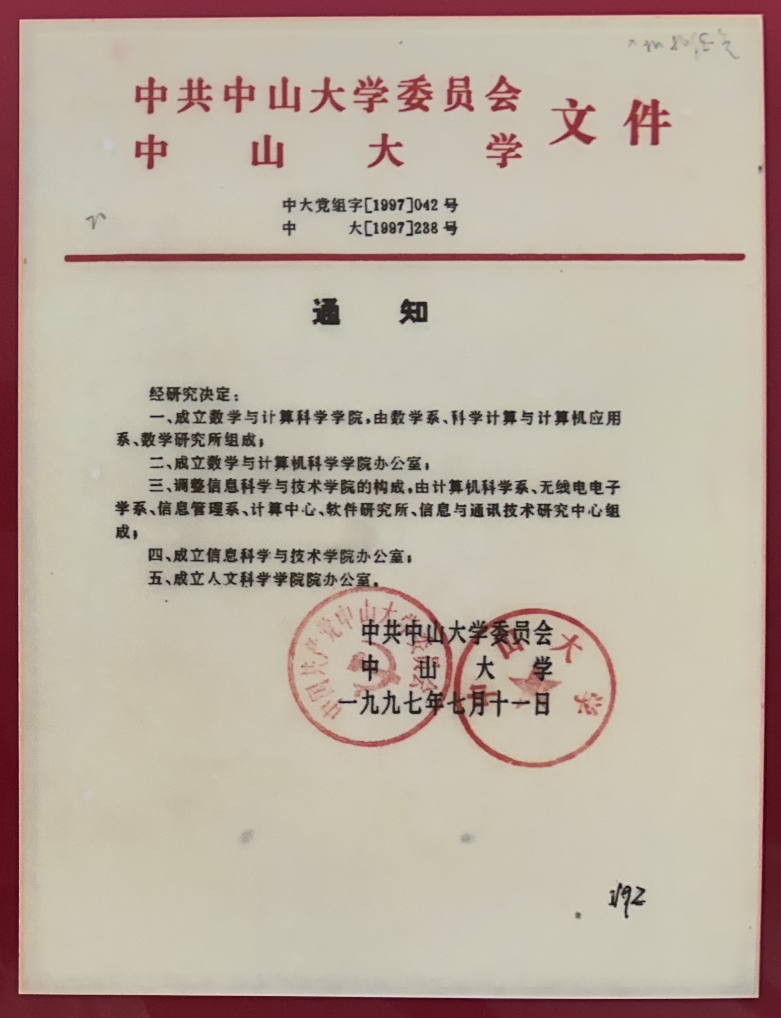 1997年7月,402永利集团官网重组1996年成立的信息科学与技术学院,将原属岭南学院的计算机科学系、软件研究所划归信息科学与技术学院,科学计算与计算机应用系并入数学与计算科学学院。