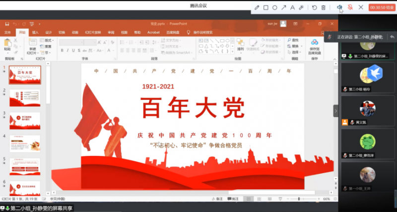 孙静雯同学首先结合个人体会指出学习党史有助于我们认识国情、坚定理想信念、加强党的建设等重要意义,同时,她围绕党史的发展脉络,带领同学们回顾了党在不同时期(新民主主义革命时期、社会主义革命和社会主义建设时期、改革开放和社会主义现代化建设时期)的发展情况,并在此基础上结合个人体会分享了中国共产党百年历史的宝贵经验。最后,她从自身出发,分享了如何做一名合格的党员。