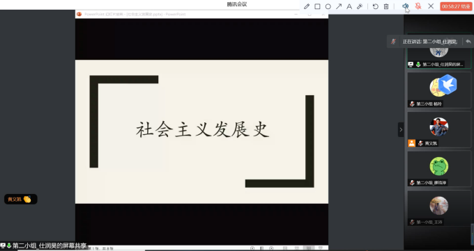 仕润昊同学回顾社会主义六个时间段的特点,从理论上给我们梳理了社会主义的发展历程:空想社会主义产生和发展、马克思恩格斯创立科学社会主义理论体系、列宁领导十月革命胜利并实践社会主义、苏联模式逐步形成、新中国成立后我们党对社会主义的探索和实践、我们党作出进行改革开放的历史性决策、开创和发展中国特色社会主义,最后她指出,21世纪社会主义的主流是科学社会主义,科学社会主义的主力是中国特色社会主义。