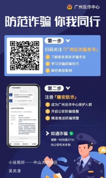 为保障大家财产不受侵害,请各位同学积极关注 “广州反诈服务号”,并注册“穗安防诈”小程序,当遇到诈骗行为时,能够有效得到提醒保护。
