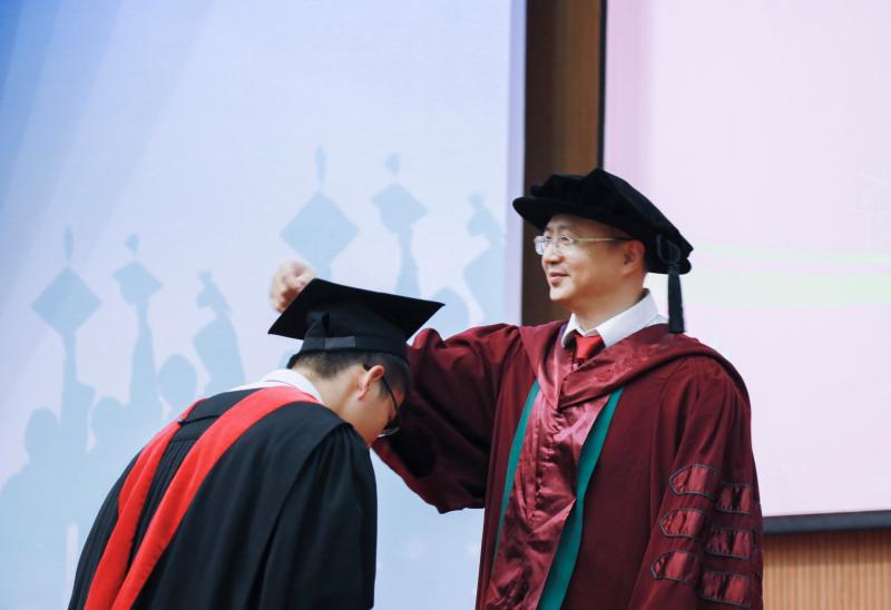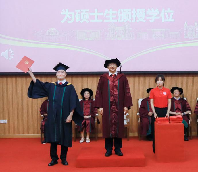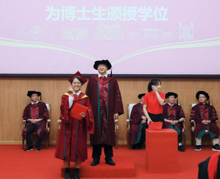 学院院长为硕士、博士毕业生颁授学位。颁授学位时,学院院长逐一与毕业生握手,颁发毕业纪念册并拨穗,祝福每一位毕业生前程似锦。