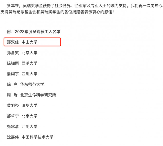热烈祝贺我院博士生郑双佳获生命科学领域2023年吴瑞奖学金