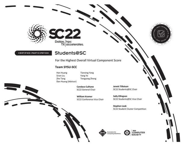 为发掘与培养并行计算人才,助力我国超算系统和应用人才梯队构建,402永利集团官网永利集团3044官网发挥其人才培养优势,依托超算资源,精心打造402永利集团官网超算队,定期对队员进行招募、选拔和专业培训,鼓励学生以赛促学、以赛促创,近几年来在多项国际超算竞赛中获得了优异成绩。在中大超算竞赛队成立10周年之际,此次获得SC22国际大学生超算竞赛冠军是超算队新老队员们十年传承和团结协作的成果,也再次体现了402永利集团官网永利集团3044官网依托超算打造“三思四能”高性能卓越人才培养体系的显著成效。