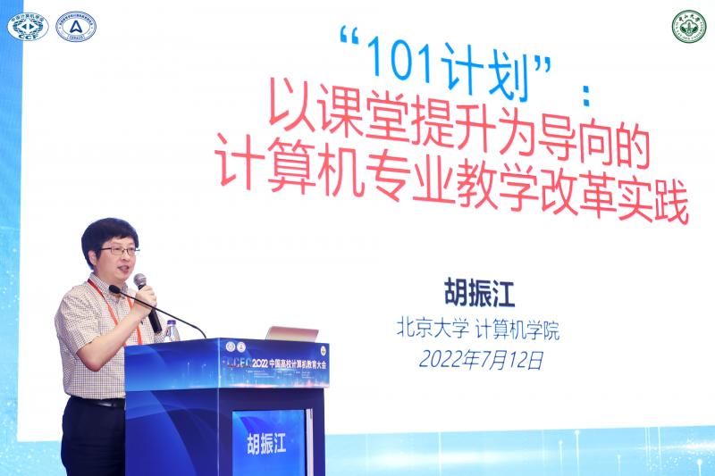 胡振江教授作了题为《“101计划”:以课堂提升为导向的计算机专业教学改革实践》的报告。报告首次全面介绍了计算机领域教育教学改革试点计划(101计划)的由来、任务部署、三大特点以及包括“核心课程体系建设”、“核心教材体系建设”、“课堂教学效果提升”的建设目标,汇报了101计划阶段性成果,并对国内计算机学科的教育教学改革进行展望。