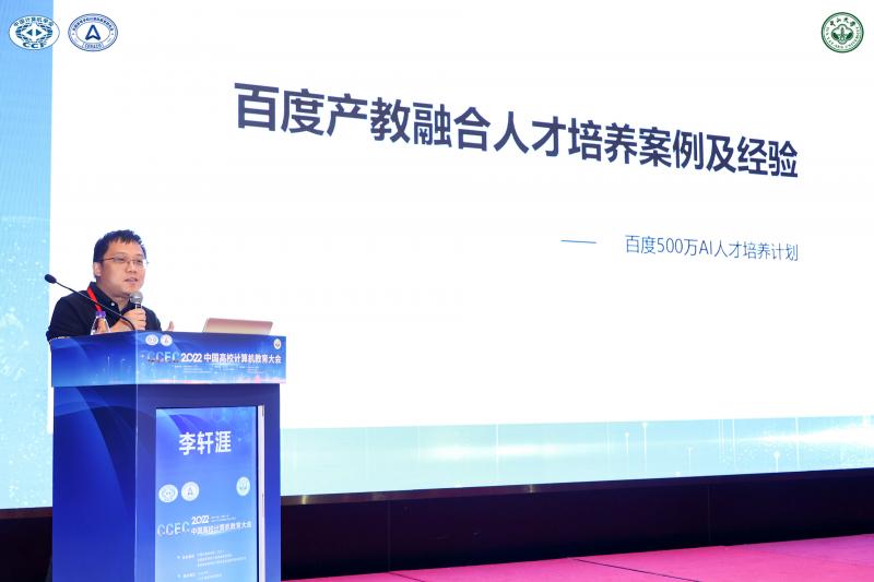 百度公司李轩涯博士作了题为《百度产教融合人才培养案例及经验》的报告。报告介绍了百度与中国计算机学会等各类学术组织及高校在科学研究、学科共建、人才培养等多方面开展合作典型案例,分享了包括教材、题库、课程、师资培训课程、大学生职业素能培训课程、AI实训平台等人才培养内容,并总结了百度产教融合协同育人的经验和成效。