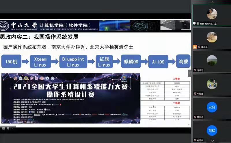 会议开始,我院校级思政示范课程负责人依次汇报了课程思政建设情况。陈鹏飞副教授首先介绍了如何将操作系统课程的理论学习与国家需求关联起来,通过在教学中介绍我国操作系统的发展历史,让学生了解国产操作系统与国外操作系统之间的主要差距;结合具体科研人物介绍科学家具有的科学精神,指导学生立大志、做大事,为我国操作系统研制做出贡献。
