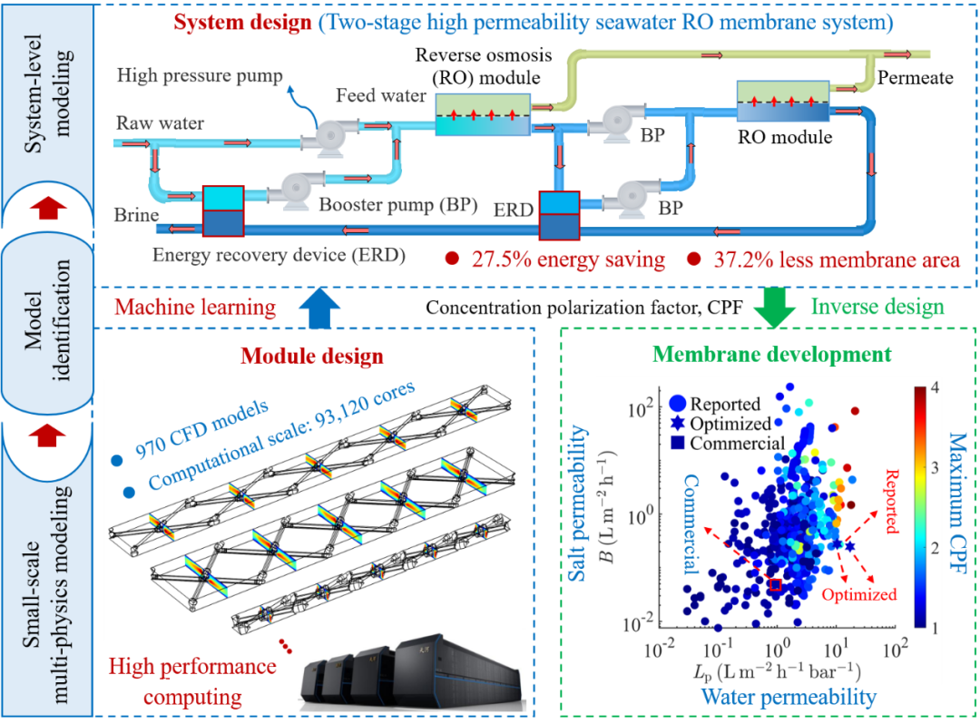 ▲基于超算的机器学习驱动高渗透性海水反渗透膜系统多尺度设计框架