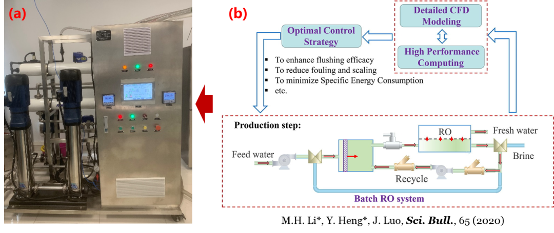 (a)自主设计搭建的批处理式反渗透实验平台; (b)批处理式反渗透工艺流程及基于模型最优实验设计思路