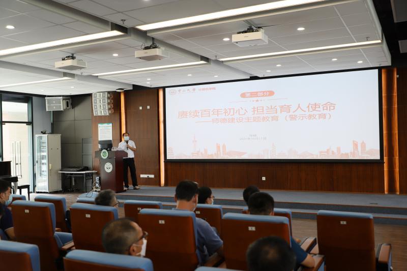 随后,马啸书记作师德建设宣讲和警示教育。他以“赓续百年初心,担当育人使命”为主题,以“坚定理想信念、厚植爱国情怀、涵养高尚师德”为主线,带领全院教职工全面学习了《新时代高校教师职业行为十项准则》,并通过深入剖析9种反面案例,进一步向全院教职工开展师德警示教育。马啸书记强调,作为高校教师,要以习近平新时代中国特色社会主义思想为指导,不忘立德树人初心,牢记为党育人为国育才使命,提高政治站位,自觉爱国守法,潜心教书育人,关心爱护学生,坚决杜绝师德失范行为。