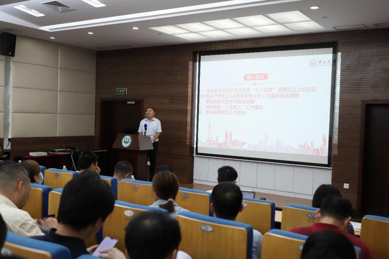 会上,马啸书记首先传达学习习近平总书记在“七一勋章”颁授仪式上和在庆祝中国共产党成立100周年庆祝大会上的重要讲话精神。马啸书记强调,新时代的中国青年要以实现中华民族伟大复兴为己任,增强做中国人的志气、骨气、底气,不负时代,不负韶华,不负党和人民的殷切期望!接着,马啸书记通报了我院党史学习教育进展、“三全育人”工作情况以及课程思政工作建设情况。学院党委成立了党史学习教育领导小组和工作小组、制定了开展党史学习教育的实施方案和详细的工作安排、召开动员大会和专题辅导报告,党委理论学习中心组完成了4个专题学习,全体党员领导干部和党委委员均至少完成1次党史学习教育专题党课;党支部共开展98次党史学习教育组织生活、共组织38次“我为群众办实事”系列活动,全体在校党支部书记至少完成1次党史学习教育专题党课。学院党委和党支部党史学习教育党组织任务清单均完成,党史学习教育取得的阶段性成果。