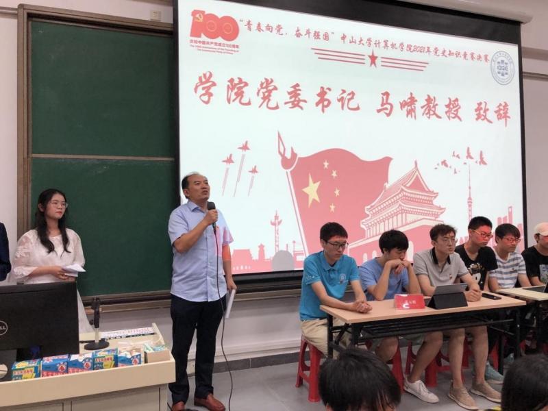 奏唱国歌后,学院党委书记马啸教授致辞。马书记讲到今年是建党100周年,这100年的筚路蓝缕,中国共产党带领中国人民实现了救国、兴国、富国、强国的伟大事业。中共党史是中国共产党和中华民族的宝贵精神财富,是推进中国特色社会主义伟大事业和建设党的新的伟大工程的重要力量源泉。党史知识竞赛作为学院党史学习教育的重要环节之一,通过举办党史知识的初赛和决赛,以测促学、以赛促知。希望同学们认真参与和学习,树立正确的唯物主义史观,把党史学习成效转化为工作动力,在学习工作中发挥先锋模范作用,为国家和社会发展事业添砖加瓦。