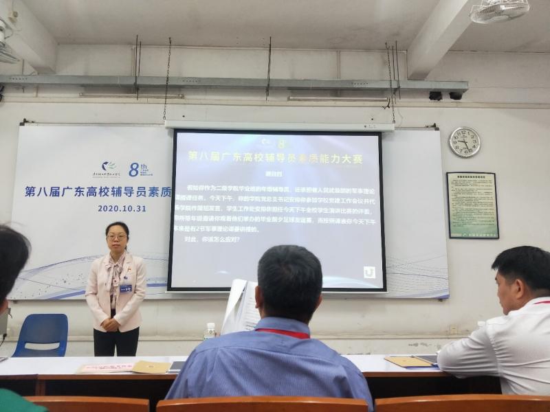 2020年10月31日,第八届广东高校辅导员素质能力大赛决赛在广东轻工职业技术学院(南海校区)举行。我院学生辅导员黄玲娟凭借扎实过硬的综合素质与职业能力获评一等奖。