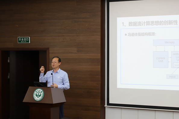 国防科技大学窦勇教授分享的是“计算机体系结构的平衡设计思想”,他从计算机体系结构设计方法方面的平衡设计思想开始,结合计算机体系结构发展历程分析数据流计算机体系结构的发展脉络,带领同学们更加深入地了解计算机;从数据流计算机起源到CPU、GPU中数据流计算思想的体现,分析定制智能算法加速器的优势,让同学们更加深刻地了解了数据流的思想模式。