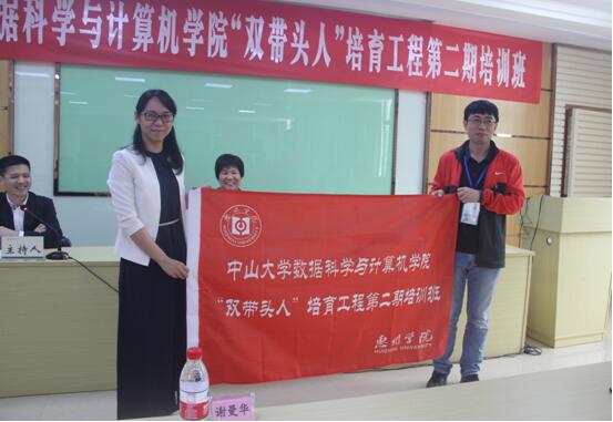 本期“双带头人”培训班班长吴维刚教授在开班典礼上接受班旗 培训期间,分别安排了专题辅导报告、现场教学及业务学习等教学内容。学员们听取了全国教育大会精神专题辅导报告;在叶挺将军纪念园进行了现场教学,了解了叶挺将军二十余年来跌宕起伏、艰难辉煌的革命生涯,深刻感受了“不怕牺牲,不屈不挠,坚持信仰与真理,视死如归”的叶挺精神以及“铁的信念、铁的纪律、铁的意志、铁的作风”的“铁军”精神;在新农村建设的现场教学中,学员们参观了全国文明示范村——博罗县罗阳镇观背村,通过文化产业的植入和熏陶,将原本残旧落后的小乡村打造成为集文化交流、文化创作、文化观光为一体的文化聚集地,让大家领略到了新时代新农村蜕变的典范。为提升业务骨干们的实际工作能力,本次培训延续了“双带头人”培育工程第一期的业务培训内容,开展了学院科研项目申报事项及相关制度解读、学院研究生招生及培养政策解读以及国家超级计算广州中心的资源、发展和对其他学科的支撑等业务学习。同时,谢曼华书记传达了学校秋季工作会议的精神,并对推进“双带头人”培育工程作了具体部署。学员们结合自身工作实际,进行了热烈的交流讨论。
