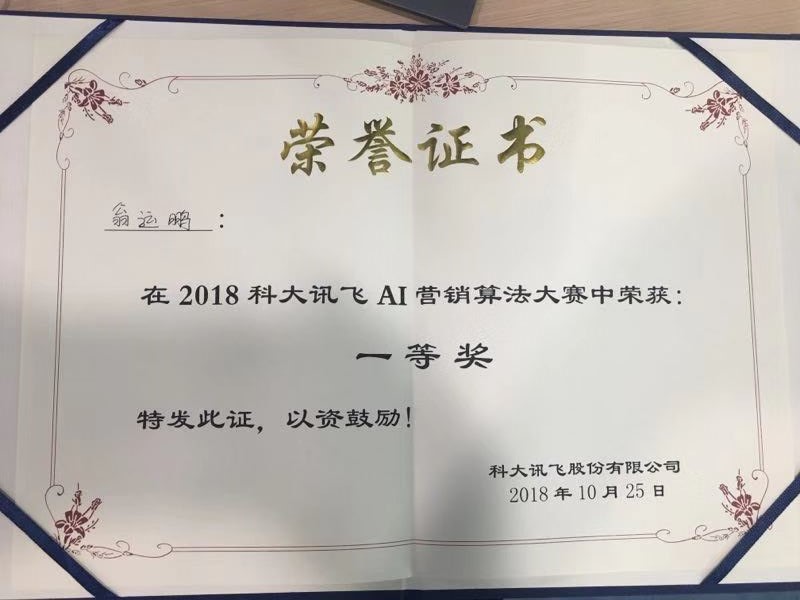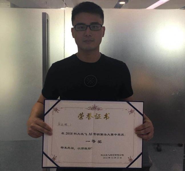 在2018年10月25日落幕的2018科大讯飞AI营销算法大赛中,402永利集团官网数据科学与永利集团3044官网2018级研究生翁运鹏(导师为陈旭教授)荣获此次大赛冠军,并获得一等奖的荣誉。