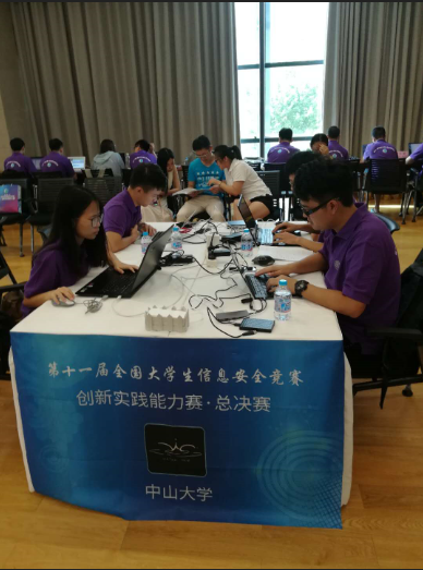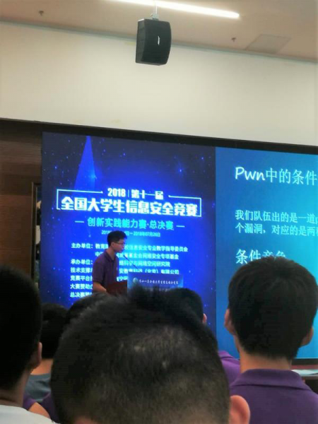 我校战队WaterDrop是国内知名战队,其成员由学院2015-2017级各专业学生组成,在指导老师帮助下,依托网络安全协会组织参赛,在近两年各类网安赛事中屡获佳绩。特别是在全国最具影响的本届赛事中表现出色,在预赛中获华南区第一名,半决赛中获华南区亚军。开赛之前,主办方宣读了各参赛队提交的Buildit作品,经专家评议,我校战队获全场唯一满分1500(各战队得分分数分布在1000~1500之间)。在决赛中队员奋力拼搏,最后名列二等奖获奖队伍之首。在赛后举行的ShareIt交流环节,主力队员李恒同学代表战队分享了BuildIt(创新安全应用开发)作品“pwn中的条件竞争与盲注”。