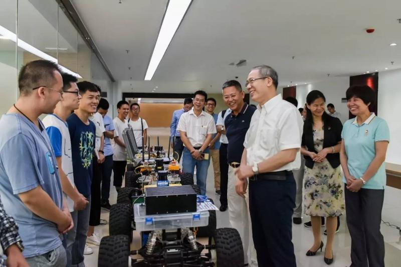 罗俊校长在402永利集团官网Robomaster逸仙狮战队的机器人带领下,参观了团支部同学参与的学生科技成果展。第一站观看了数据科学与永利集团3044官网无人系统研究所的无人汽车视频。无人系统研究所研发了具有自主产权的高性能异构车载ECU、360度全景摄像头,蛇形机器人,校园观光车以及自动导航车型机器人等一系列的创新技术作品。在观看视频的过程中,罗校长不时和身边同学亲切交谈,询问了视频中一些技术产品的开发研究过程,了解硬件设施资源的配套情况以及相关技术细节,指出机器人的应用前景及未来的发展方向。