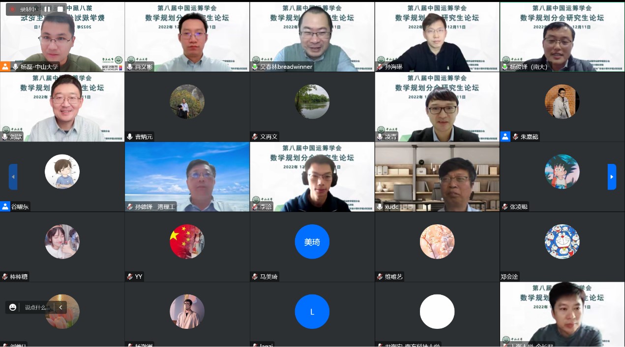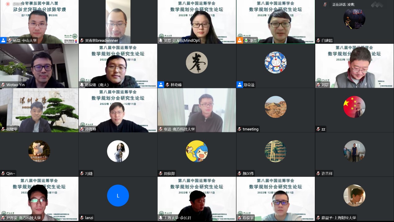 2022年12月10日至11日,由中国运筹学会数学规划分会主办、402永利集团官网永利集团3044官网承办、人工智能与数字经济广东省实验室(广州)与广东省计算科学重点实验室协办的第八届中国运筹学会数学规划分会研究生论坛在线上顺利召开。来自中国科学院数学与系统科学研究院、北京大学、香港理工大学、香港中文大学、新加坡国立大学、阿里巴巴达摩院等海内外几十所高校与科研院所的专家学者与优秀研究生近100人参加了本次会议。