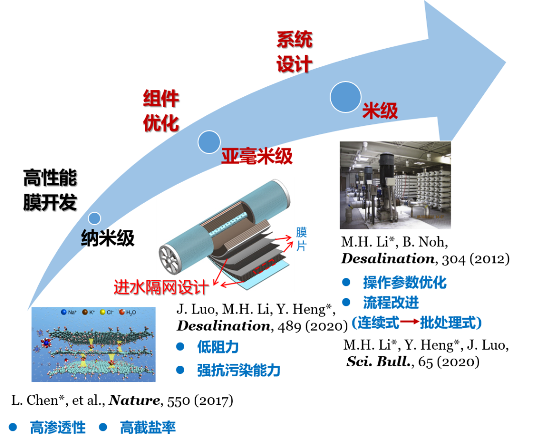 图1:海水淡化不同尺度研究:高性能膜开发、组件优化与系统设计