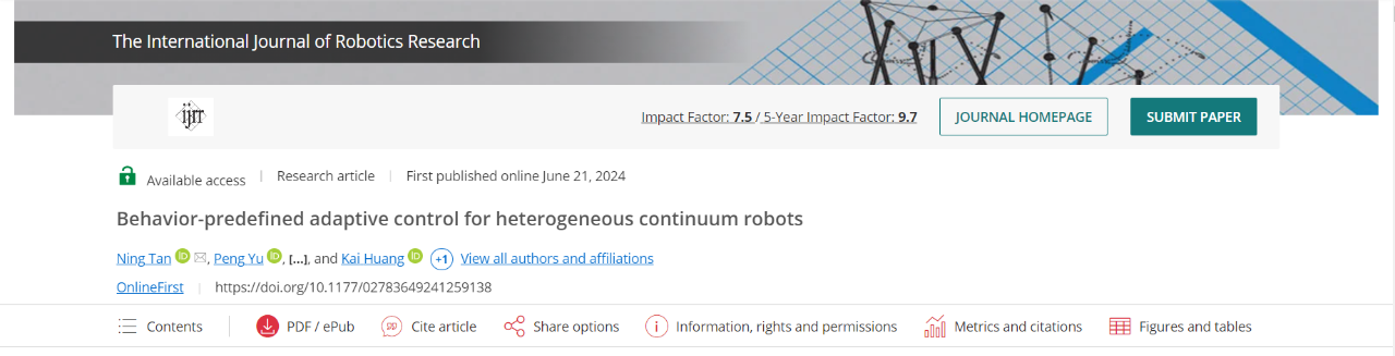 Recently, a paper on the latest research results of the Robotics Team of the School of Computer Science at Sun Yat-sen University (team led by Associate Professor Tan Ning and Professor Huang Kai) was published in the top robotics journal International Journal of Robotics Research under the title “Behavior-predefined adaptive control for heterogeneous continuum robots” . This paper is the first IJRR article of Sun Yat-sen University with the first unit. The first authors of the paper are Associate Professor Tan Ning and doctoral student Yu Peng from the School of Computer Science of Sun Yat-sen University. This research result not only provides new ideas for the development of control technology of continuum robots, but also provides valuable reference and reference for researchers in related fields.