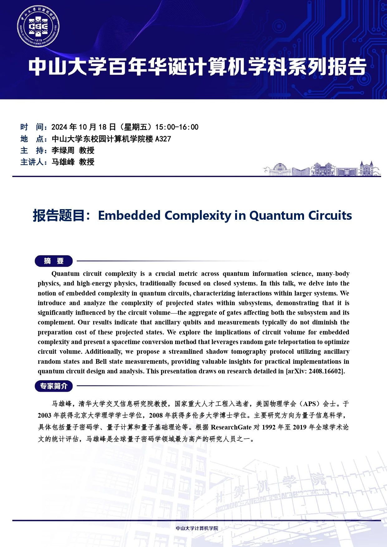 学术报告:Embedded Complexity in Quantum Circuits