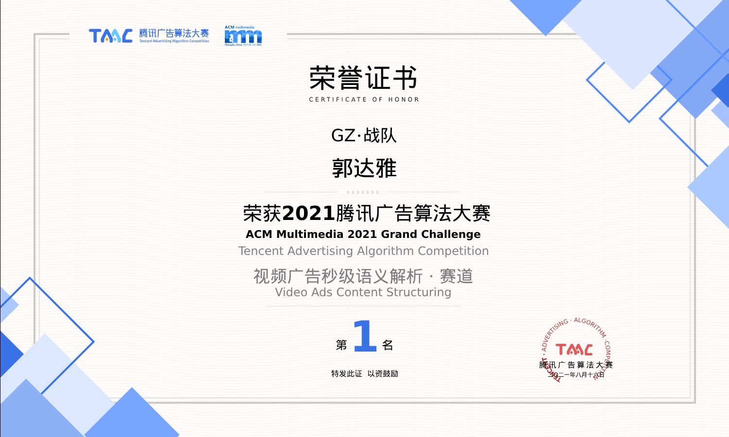 8月16日,2021年腾讯广告算法大赛与ACM Multimedia Grand Challenge在线上顺利举行决赛十强答辩。实验室2018级直博生郭达雅参加了此次比赛的答辩及颁奖环节,最终卫冕冠军,成功将100,000美金的冠军大奖收入囊中。