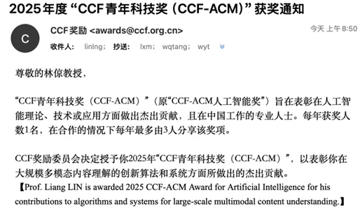 实验室主任林倞教授荣获2025年度“CCF-ACM人工智能奖”