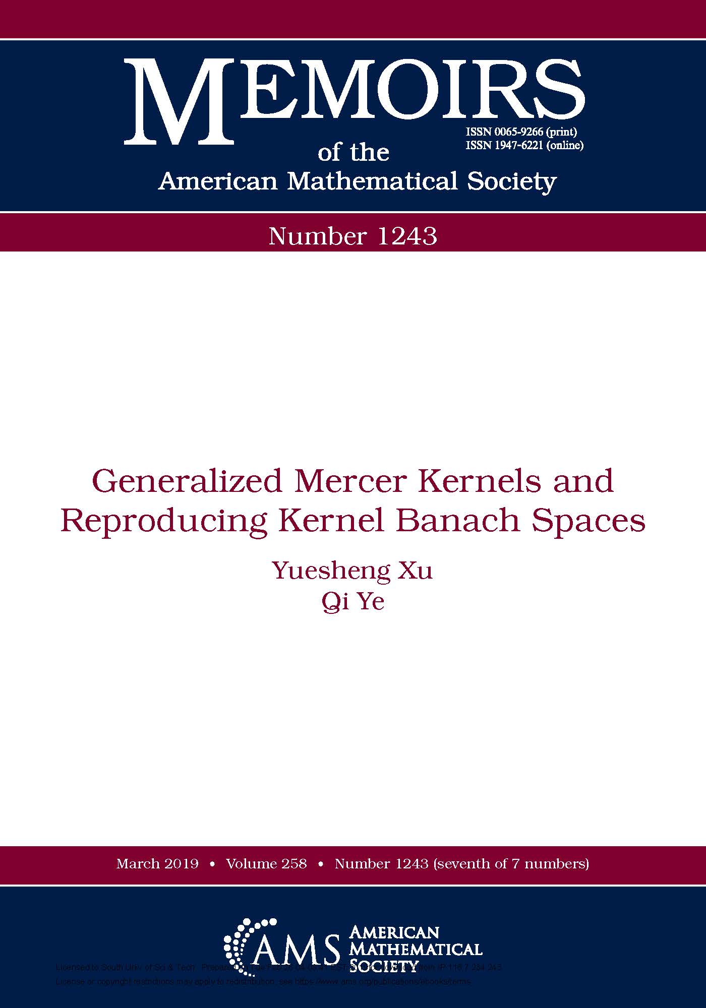 [1] Yuesheng Xu and Qi Ye, Generalized mercer kernels and reproducing kernel banach spaces, Memoirs of the American Mathematical Society 258 (2019) no. 1243, 1-122.