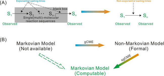 该研究解决了生化反应系统(包括生物分子网络)研究领域中的一个长期未解决的问题,即如何建模和分析带有分子记忆的生化反应系统。为此,作者创新性地建立起一套实用理论,其核心是静态广义化学主方程,它把一个非马氏问题转化为一个马氏问题,并由此揭示出非马氏生化反应系统的本质特性。