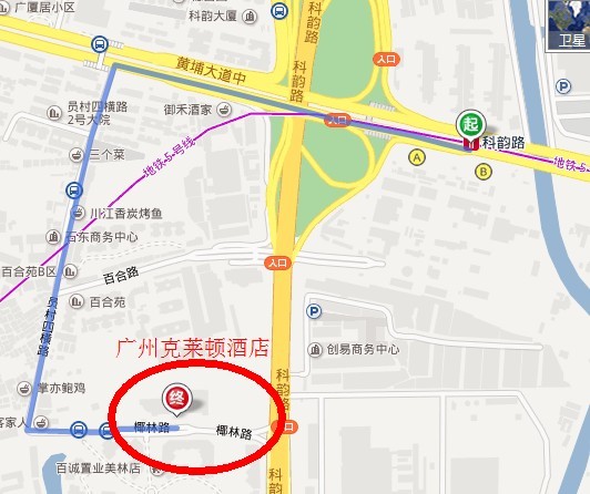广州站—酒店:乘坐地铁5号线(文冲方向),在科韵路站下车,从A出口出站,步行至酒店,全程约50分钟。